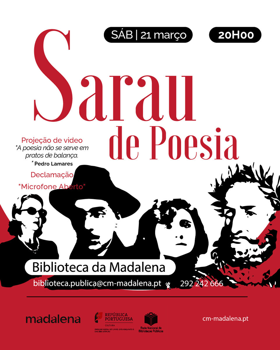 Biblioteca da Madalena assinala Dia Mundial da Poesia com Sarau Poético A Biblioteca Municipal da Madalena assinala este sábado, dia 21 de março, pelas 20h, o Dia Mundial da Poesia com um Sarau Poético... Há 26 minutos
