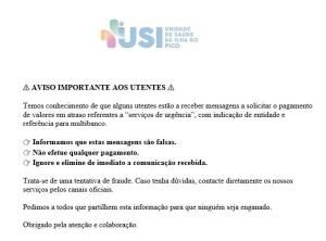 A USIP, Unidade de Saúde da Ilha do Pico, informa em comunicado que teve conhecimento de utentes a receber mensagens a solicitar o pagamento de valores em atraso referentes a serviços de urgência com indicação de identidade e referência de multibanco.