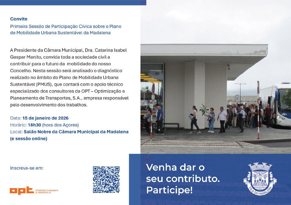 No âmbito do processo de elaboração do Plano de Mobilidade Urbana Sustentável da Madalena, será realizado, quinta-feira, 15 de janeiro, pelas 18h30, um Webinar, incentivando a participação pública no desenvolvimento deste documento estratégico.